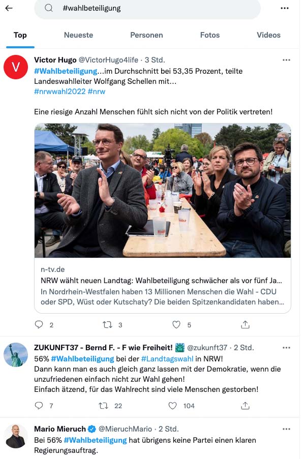 Die Politiker- und Politikverdrossenheit in Nordrhein-Westfalen ist gewachsen. Damit bleibt „alles beim Alten“ wie Nils Schwede twittert – „höhere Steuern und Abgaben, Inflation, Energie- und Spritpreise, Diäten“. Die #Wahlbeteiligung bei den letzten beiden Landtagswahlen müsse alle Parteien alarmieren, schreibt Gazi Freitag in Twitter. „Eine Politik, an deren Gestaltung über 40 % der Menschen nicht interessiert sind, verliert ihre Kraft.“ Die grausam geringe #Wahlbeteiligung sei das eigentliche Problem und Desaster an diesem Wahlabend, twittert Nils Heisterhagen. Also „Klappe halten“ empfiehlt Lorenzo von Matterhorn in Twitter. „44 % der Wahlberechtigten in #NRW dürfen bei politischen Diskussionen die nächsten fünf Jahre mal gepflegt die Klappe halten! Man, man, man“.