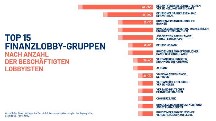 Unter den Finanzlobbyisten ragt der Gesamtverband der Deutschen Versicherungswirtschaft­, GDV­, heraus, der laut „Finanzwende“ 15 Millionen Euro jährlich in die eigene Lobbyarbeit auf Bundesebene investiert und damit Platz 1 unter den Verbänden mit dem höchsten Lobbybudget einnimmt. In der Sparte der Einzelunternehmen belege die Deutsche Bank mit rund 3,5 Millionen Euro an Lobbyausgaben den 4. Platz.