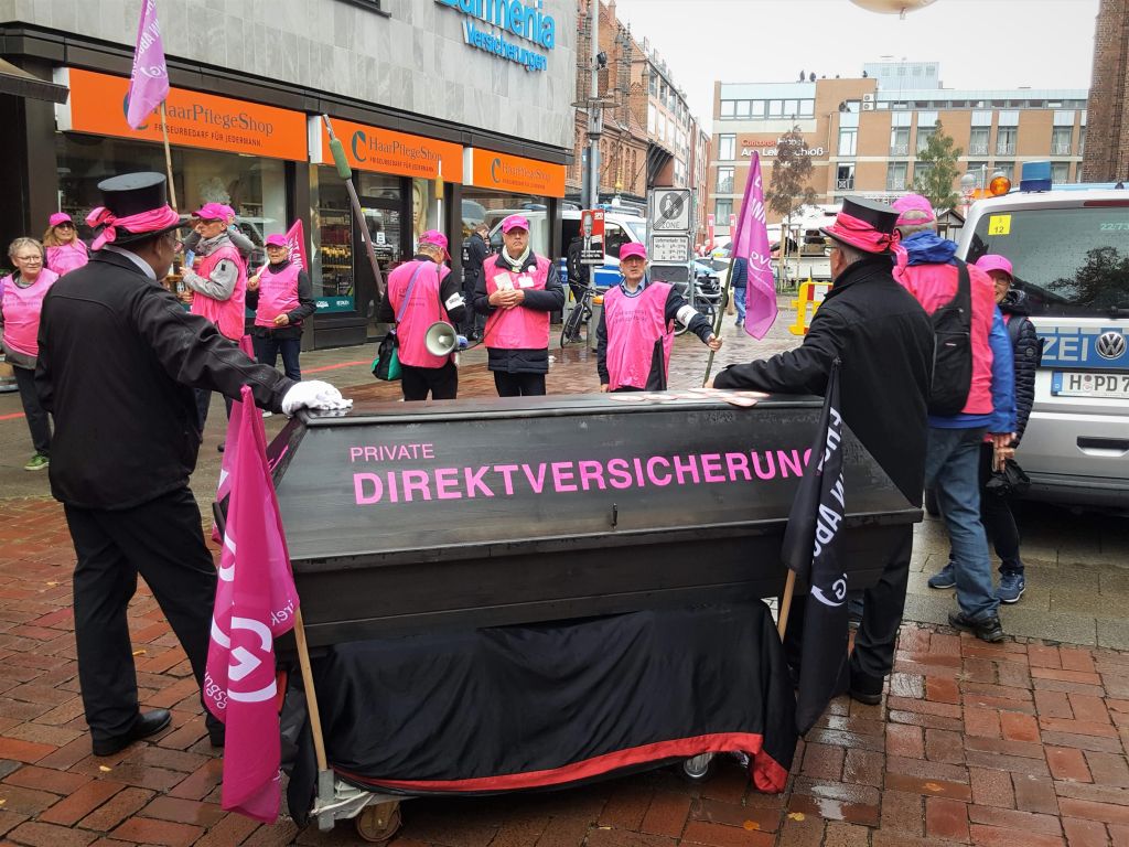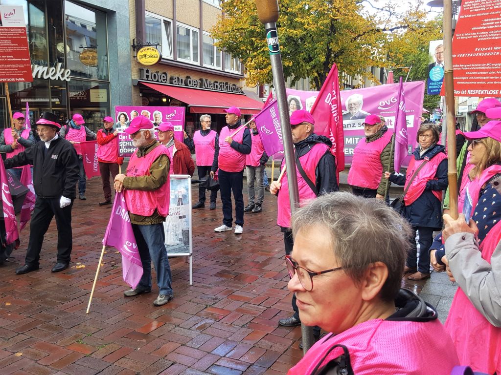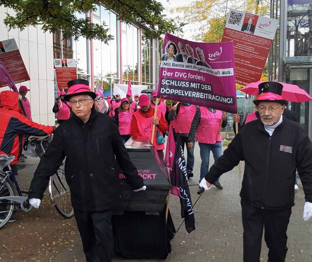 Mit Sarg („Private Altersversorge und Betriebsrente werden zu Grabe getragen“), zahlreichen Plakaten, Bannern und Megafon hat eine aktive DVG-Delegation zum Wahlkampfabschluss der Landtagswahl in Niedersachsen am Samstag, 08.10.2022, einen Protestmarsch in der Landeshauptstadt Hannover durchgeführt.